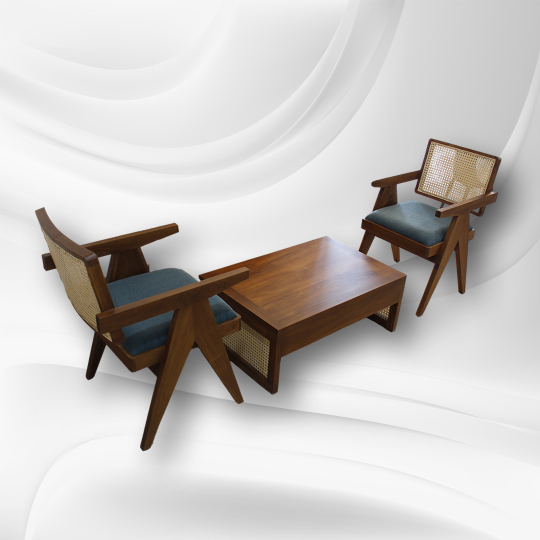 Add a touch of retro charm to your living space with our Mid-Century Modern Lounge Set. This stylish ensemble features two armchairs and a matching coffee table, all crafted from rich, warm-toned wood. The armchairs boast a distinctive design with woven cane backrests and plush, blue-grey cushions, offering both comfort and visual appeal. The coffee table, with its clean lines and rectangular shape, provides a perfect surface for drinks, books, or decorative items.