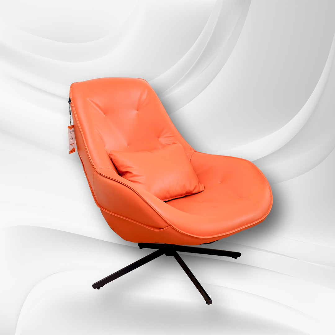 This stylish piece features a comfortable, contoured chair upholstered in a vibrant orange fabric. The chair’s design is both inviting and modern, with a unique, curved shape that provides excellent support. The chair swivels on a sleek, black base, adding a touch of contemporary elegance and functionality. A matching orange cushion adds extra comfort and style.